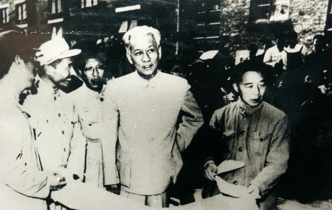 |1960年,我校第一任校长景晓村陪同刘少奇同志在德阳基建工地视察