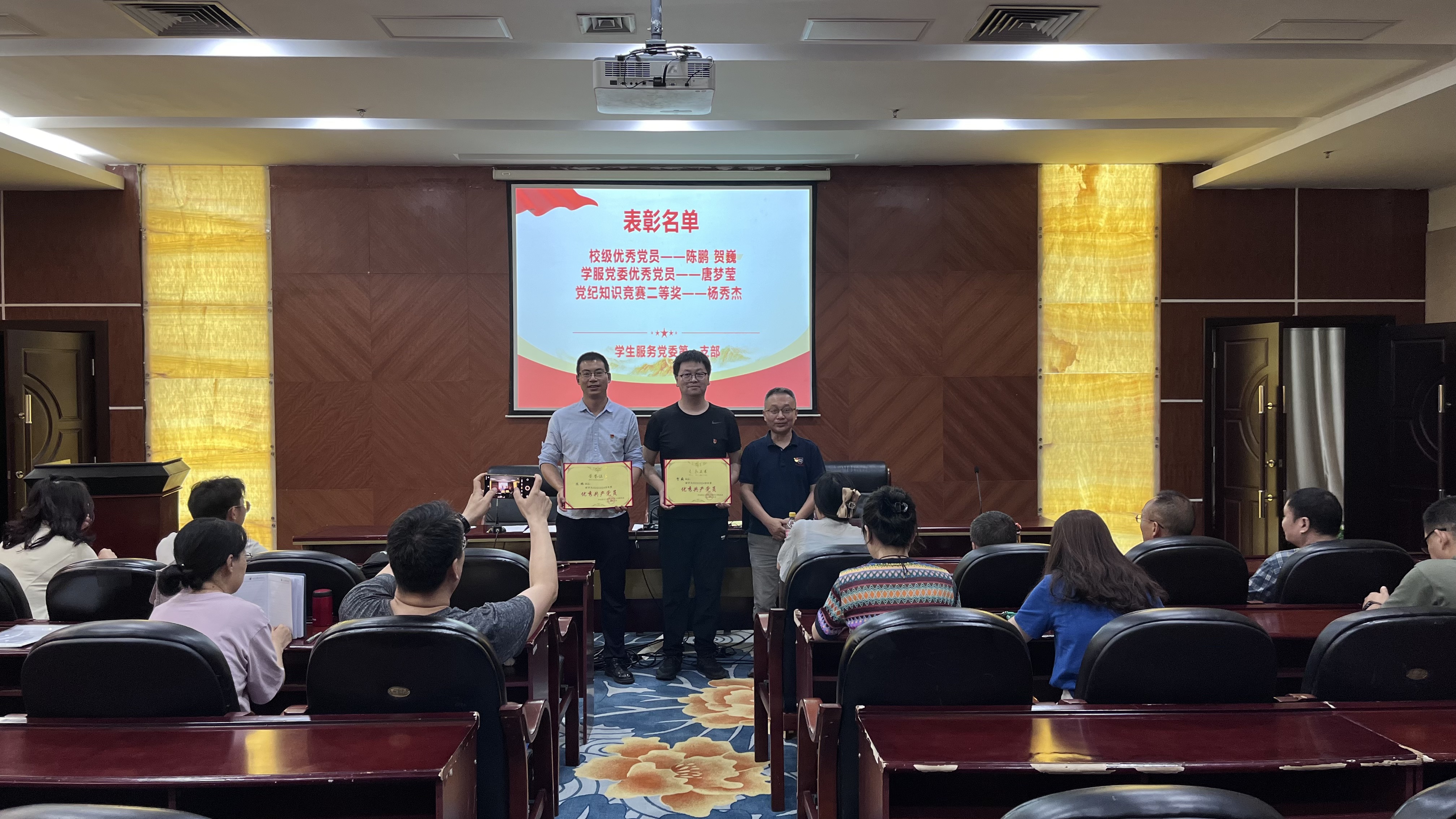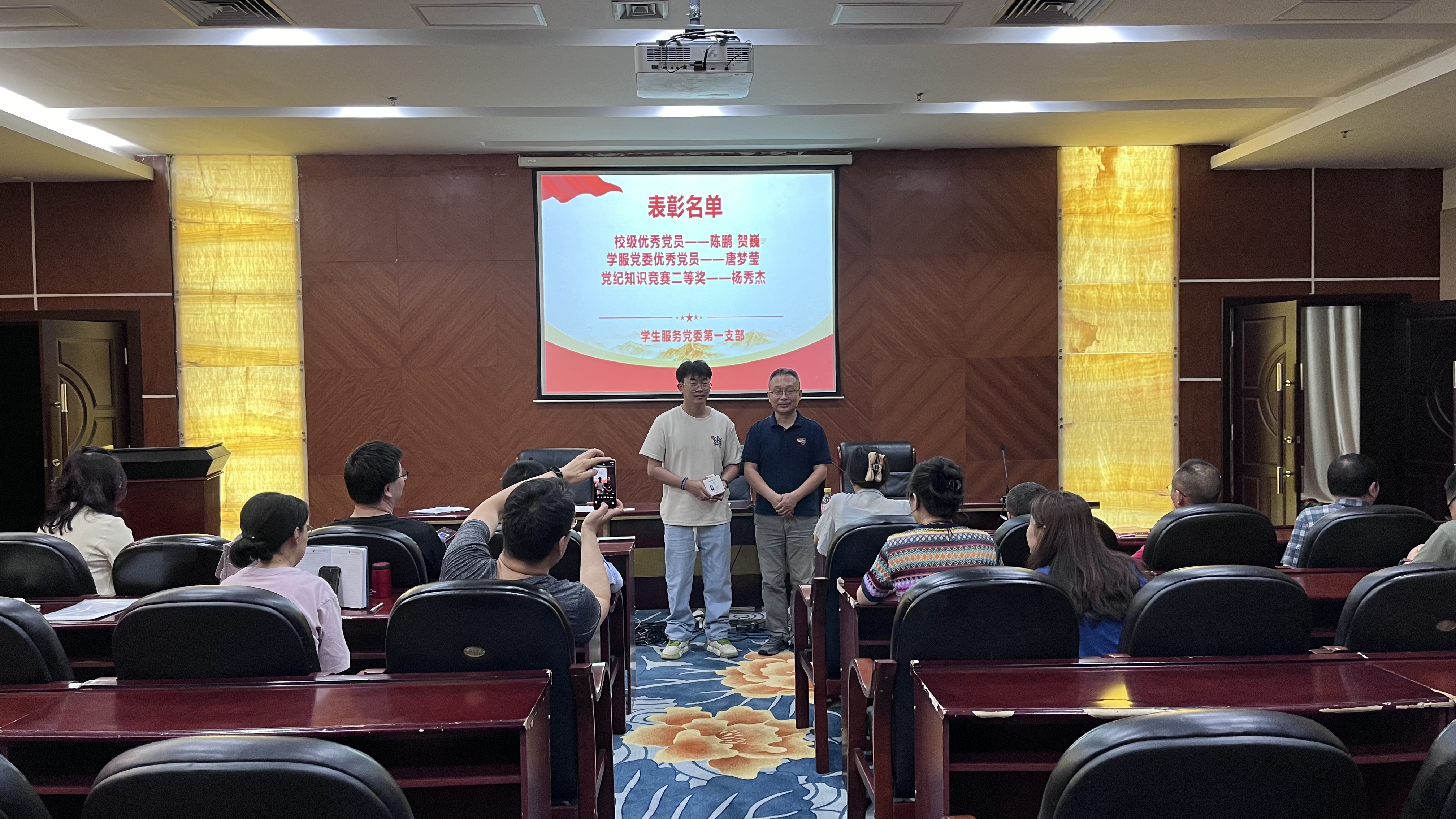 学生服务党委第一支部书记唐军宣读“校级优秀党员”“学生服务党委优秀党员”“党纪知识竞赛获奖”的表彰决定,学生服务党委书记廖秀勇对获嘉奖的同志进行颁奖。