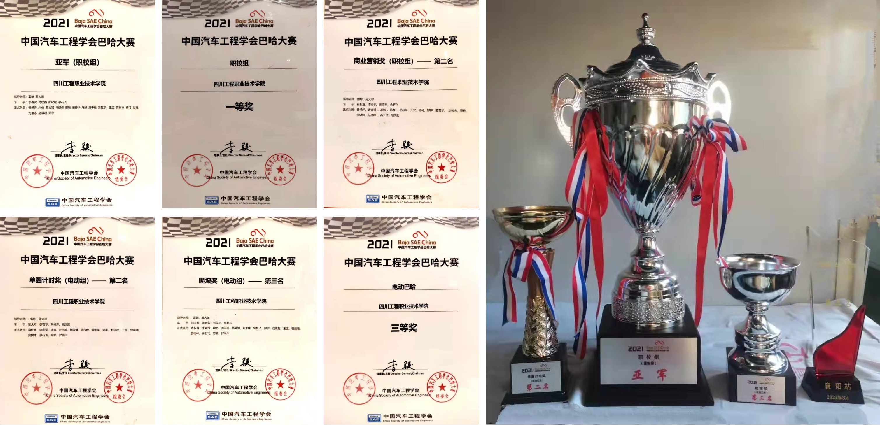 2021年9月28日,由中国科学技术协会指导,中国汽车工程学会主办、襄阳市政府支持的全国大学生巴哈大赛在襄阳梦想汽车小镇圆满落幕。本次大赛共有来自全国本科院校、职业院校的65支参赛队伍同台竞技。我校巴哈车队油巴哈总成绩继2018年获得一等奖(季军),2019年获得一等奖(亚军)后,2021年再次荣获一等奖(亚军),连续三次挺进职校组前三名。电巴哈总成绩荣获本专科第6名。