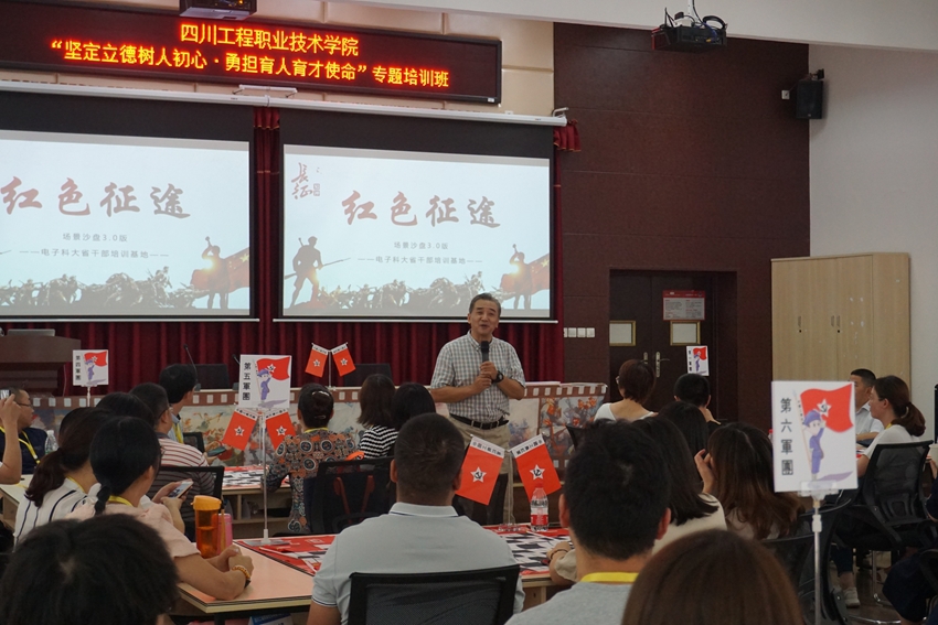 专题授课环节,四川省干部教育培训电子科技大学基地研究院、四川大学全国干训基地指定培训导师江英俊副教授分别以体验式教学和拓展教学的方式进行了党史足迹与团队建设和管理创新的教学。