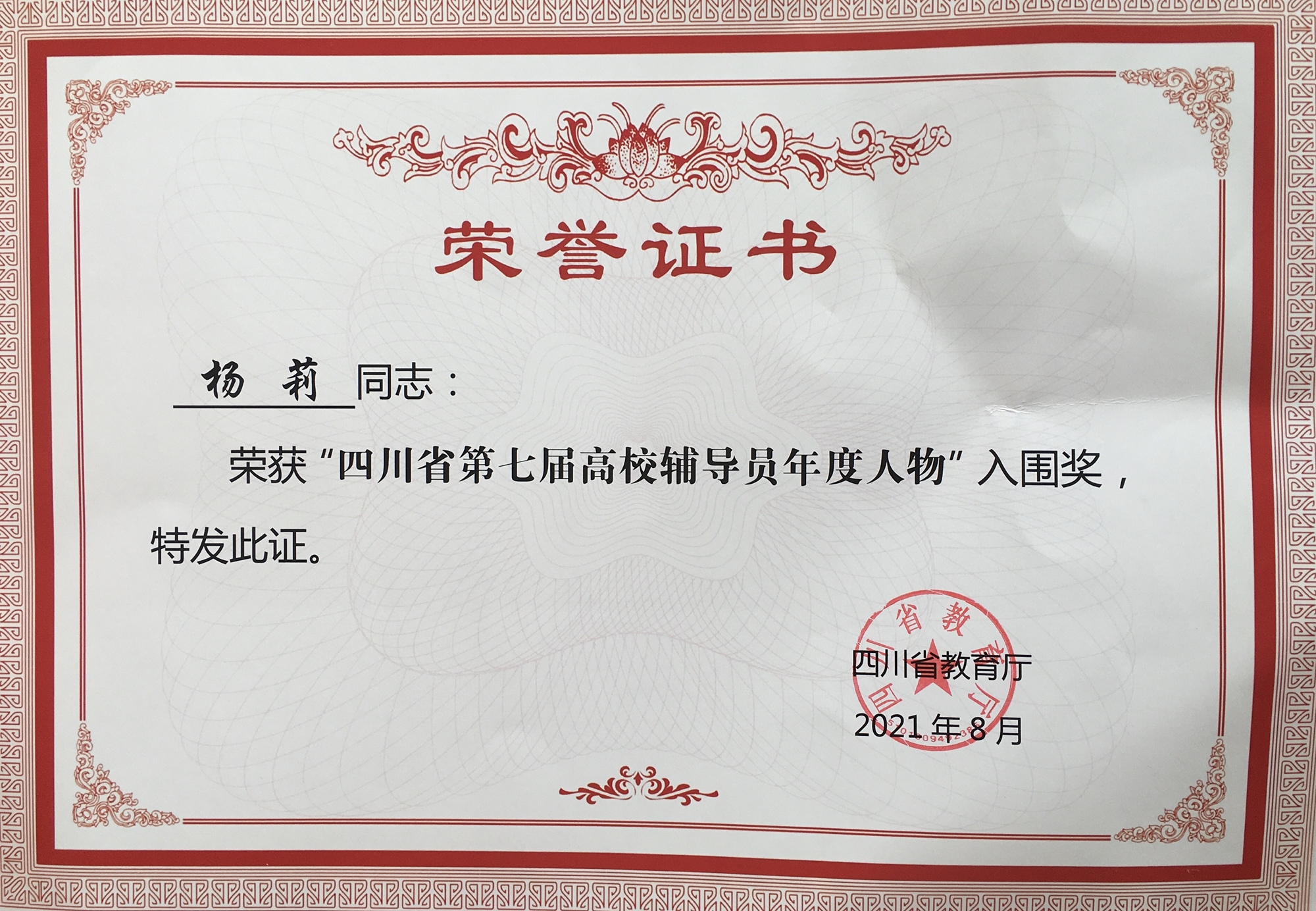 近日,我校机电工程系辅导员杨莉同志荣获“四川省第七届高校辅导员年度人物”入围奖。