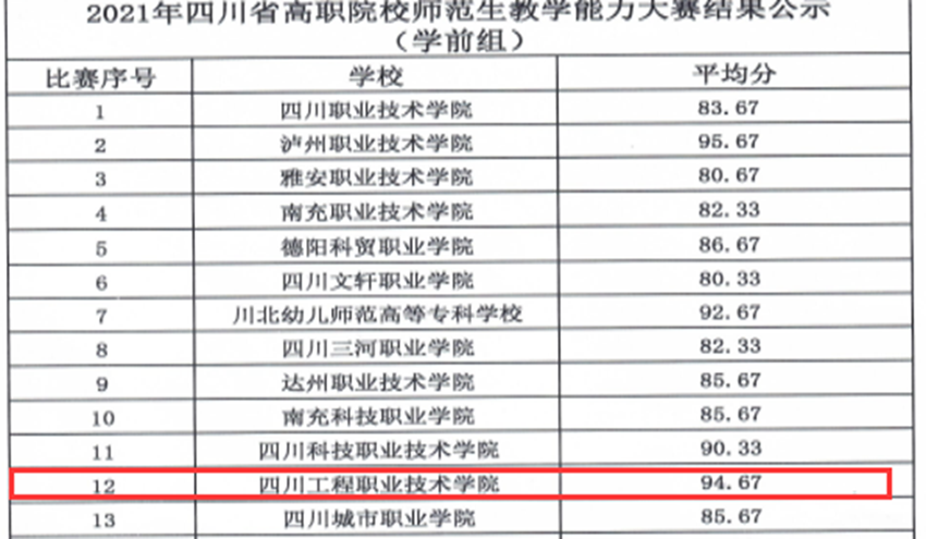 6月18-20日,2021年第一届四川省高职院校师范生技能大赛在泸州职业技术学院举行,学前教育组全省共19支队伍参加比拼。经过激烈角逐,由我校艺术系学前教育教研室李照会老师、马丽群老师、李静老师指导,2019级学前教育1班张唯、2019级学前教育2班卿林洋、2020级学前教育1班李梦娇组成的参赛团队在本届大赛中以94.67的高分获得学前组第二名,本次大赛一等奖。