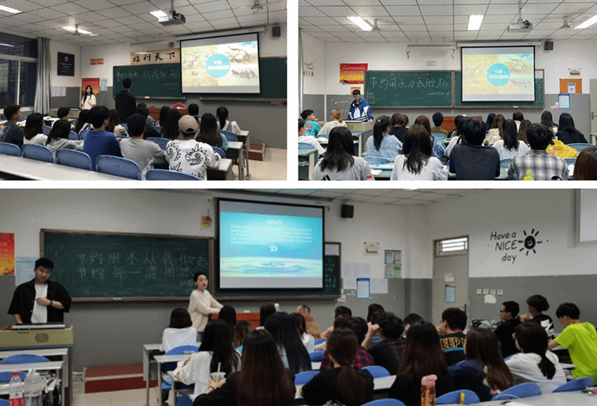 活动中,积极营造节约用水氛围,开展“节约用水,从我做起”主题班会,参加“全国节约用水知识大赛”等。主题班会上,通过宣传视频、公益广告、PPT等形式了解我国水资源现状,通过讨论、问答、抢答等形式学习关于水资源保护的知识。大家表示,节约用水要从我做起,比如,洗完手以后要关紧水龙头;洗脚、洗菜的水不要倒掉,可以留着用来浇花、冲马桶;下雨时可以拿一个盆或者拿一个桶来装雨水,接来的雨水可以洗车……