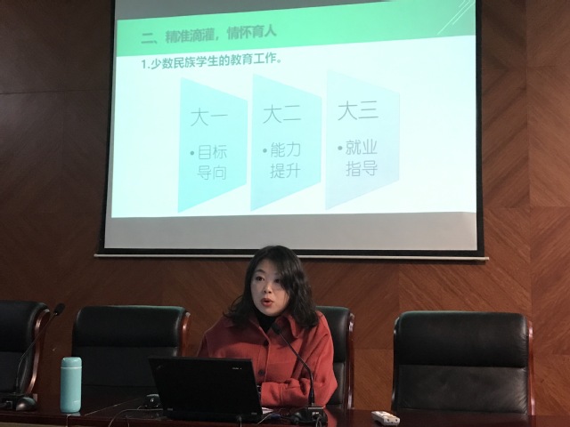 唐老师以“做学生成长道路上的引路人”为主题,分享了她从事辅导员工作13年的宝贵经验。她提炼出育人工作的三个着力点:一是在育人工作中提高政治站位,发挥榜样引领作用;二是针对对少数民族学生和特殊学生群体要精准滴灌,情怀育人;三是以教育课题研究方式提炼育人成果,增强育人工作的实效性。最后唐老师特别强调,她所分享的内容并非一家之言,而是经管系所有同事多年共同努力形成的成果。