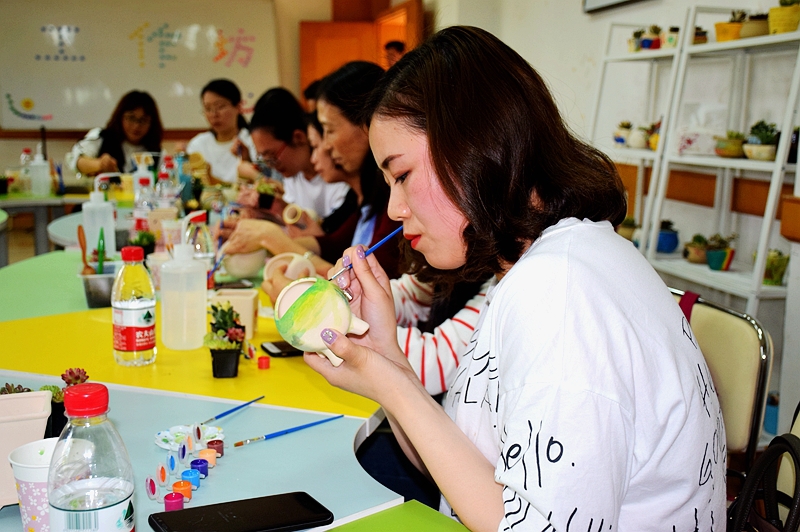 下午3点,心理咨询中心主任牛丽丽老师宣布第一期教职工心理减压工作坊活动正式开始,并向大家介绍了本期活动的背景以及活动所涉及的心理学原理。随后,唐晓红老师带领老师们以转花握手的方式进行团队破冰,帮助大家相互认识;接着,在唐老师的引导下,老师们以投射的方式将代表着理想自我和现实自我的图案绘制在陶瓷花盆上;最后,老师们将植物栽种在自己绘制的花盆中并分享彩绘和种植的体验。分享中,老师们将来自家庭、生活、工作等各方面的压力进行了宣泄和释放,度过了轻松愉快的2个小时,达到了“健心”和“怡心”的目的。活动结束时,老师们仍显得意犹未尽,纷纷表示自己已经很久没有像今天这样心情愉悦和放松了,也重新想起了那个理想中美好的自我,都希望这样的活动以后能多多开展。