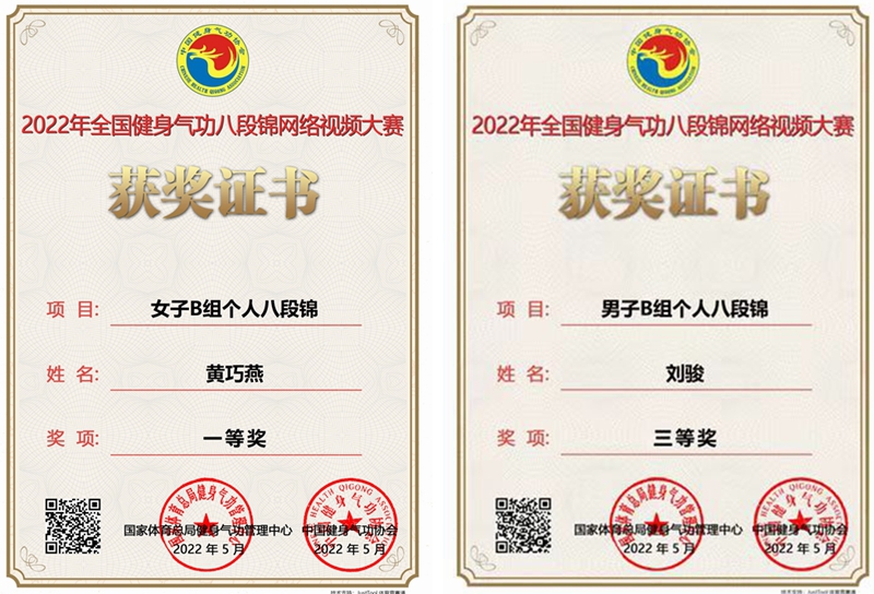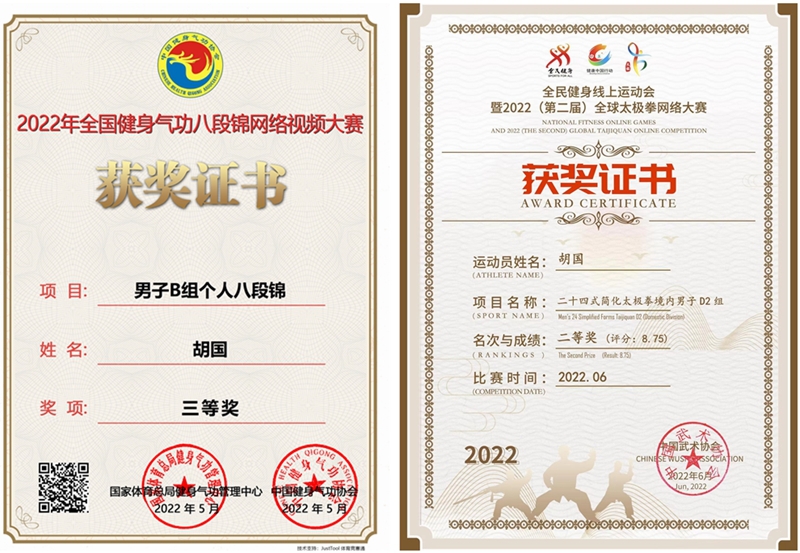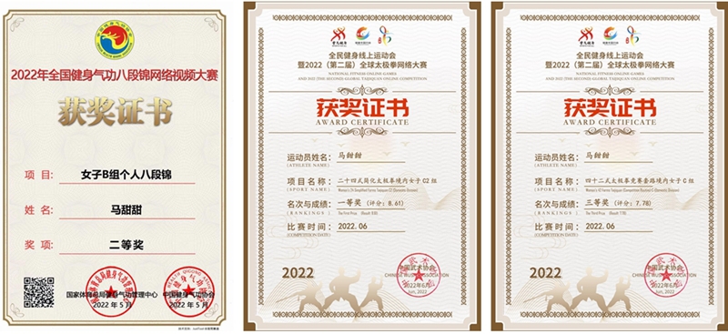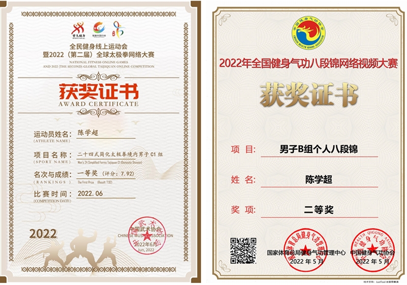 2022年5月至6月,参赛教师克服了各种困难,利用周末及课余时间进行集训,一起制定练习和比赛方案,研讨动作细节,录制比赛视频参赛。功夫不负有心人,大家在本次比赛中取得了优异成绩。在《2022年全国健身气功八段锦网络视频大赛》中,黄巧燕荣获一等奖;陈学超、马甜甜获得二等奖;胡国、刘骏获得三等奖;集体项目获得优秀奖。在《全民健身线上运动会暨2022(第二届)全球太极拳网络大赛》中,胡国荣获陈式太极拳竞赛套路一等奖、二十四式简化太极拳二等奖;陈学超荣获二十四式简化太极拳一等奖、杨式太极拳竞赛套路二等奖;马甜甜荣获二十四式简化太极拳一等奖、四十二式太极拳竞赛套路三等奖。
