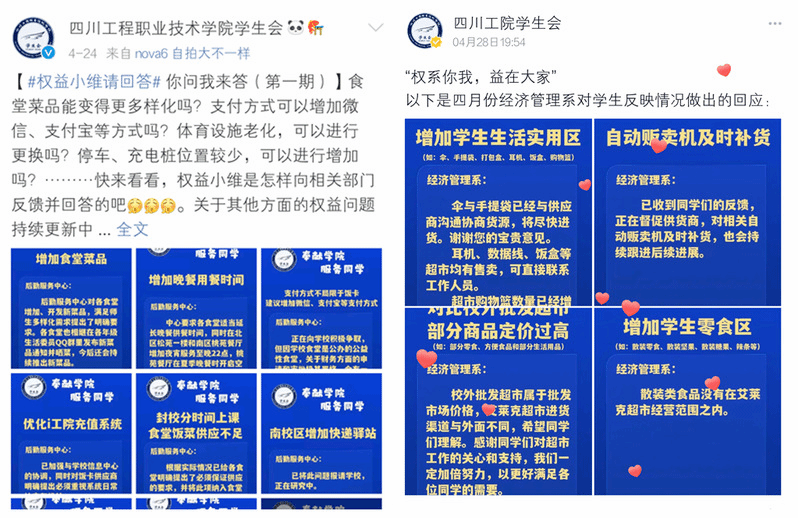 做好学生代表提案和意见征集,发挥好桥梁纽带作用。各级学生会定期进行线下权益征集,汇总相关情况给学校职能部门,并将结果在新媒体平台反馈,畅通了学生表达意见的渠道。同时,校学生会在QQ、微博设置“权系你我,益在大家”板块,供同学们反馈问题。近两年,通过学代会征集到提案200余件,通过其他渠道共收到涉及校园生活类、教育教学类等300余条意见建议。校学生会每月整理提案,分类汇总反馈至学校相关部门。