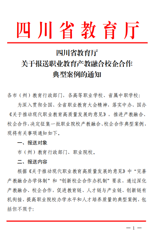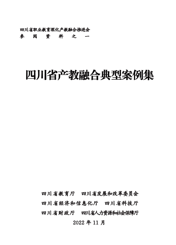 2021年10月,省教育厅印发《关于报送职业教育产教融合校企合作典型案例的通知》,旨在总结我省产教融合典型做法、推广成功经验。活动共征集到由市(州)政府、教育主管部门、学校以及行业企业推荐报送的230个案例,按照“可学习、可借鉴、可复制、可推广”的原则,通过初步筛选、专家遴选、修改完善等程序,最终确定20个案例入选《四川省产教融合典型案例集》。