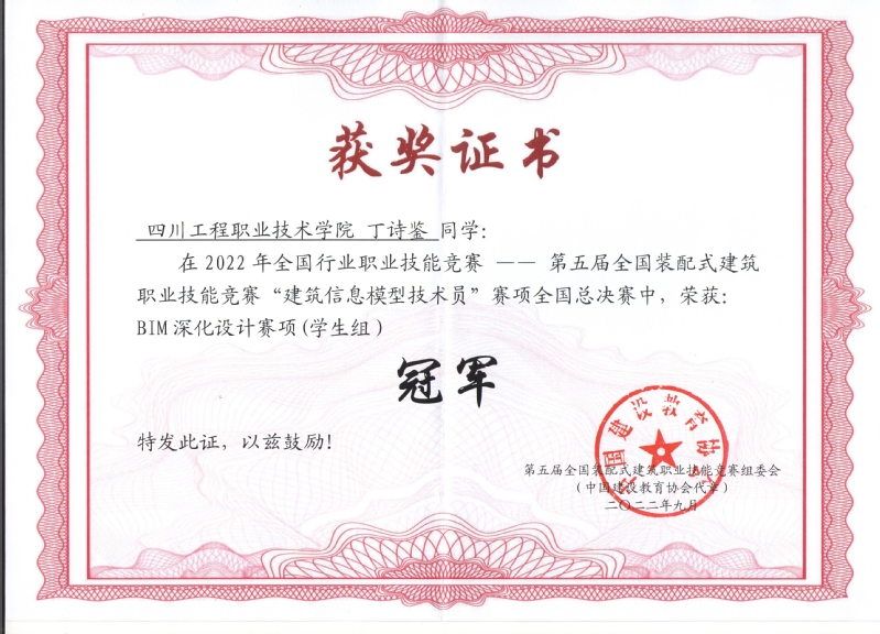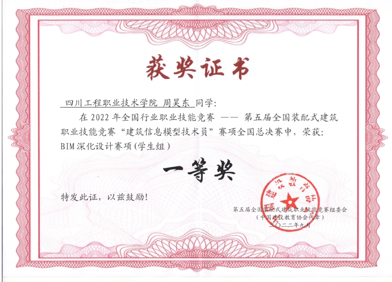 同时,建筑工程系2020级工程造价专业丁诗鉴同学和周昊东同学还在2022年全国行业职业技能竞赛—第五届全国装配式建筑职业技能竞赛“建筑信息模型技术员”赛项中,分别荣获全国第一名(冠军)和全国第四名,两个一等奖(全国共六个)。