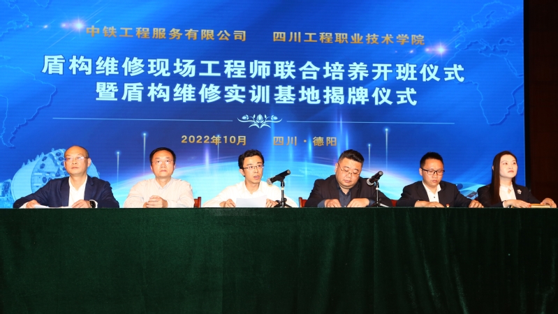 10月24日,四川工程职业技术学院与中铁工程服务有限公司在二教演播厅举行了“盾构维修现场工程师联合培养开班仪式暨盾构维修实训基地、教师流动站揭牌仪式”。四川工程职业技术学院党委副书记、院长肖峰教授,中铁工程服务有限公司党委副书记牟松总经理,四川工程职业技术学院党委常委、副院长向守兵教授,中铁工程服务有限公司装备分公司邹景军书记,中铁工程服务有限公司培训中心宋珊主任,中铁工服有限公司、交通工程系相关领导,中铁工服班项目组任课老师、中铁工服班全体学生以及学校相关专业的同学共计200余人参加了开班仪式。仪式由学校交通工程系主任肖健主持。