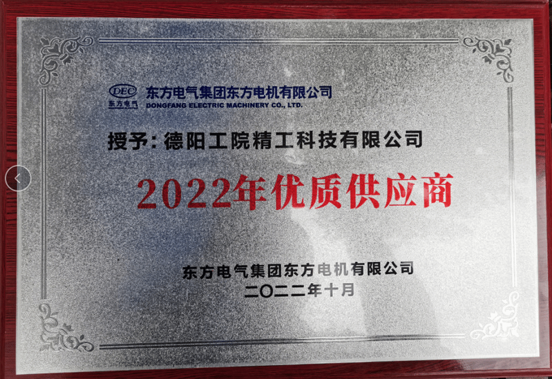 2022年10月24日,东方电气集团东方电机有限公司(简称东方电机)在德阳隆重举行2022年度供应链大会,在东方电机现有1000余家国内合作供应商中遴选出15名优质供应商进行了授牌仪式。我校实习工厂(德阳工院精工科技有限公司)以优异的业绩和良好的服务品质继2020年荣获“优质供应商”殊荣后再一次获得该项荣誉。东方电机有限公司党委副书记、总经理鄢志勇为我校实习工厂授牌。