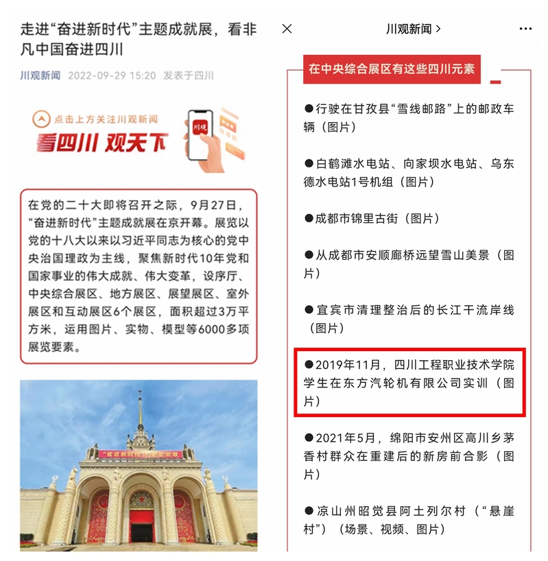 在党的二十大即将召开之际,9月27日,“奋进新时代”主题成就展在北京开幕,四川工程职业技术学院通过教育部报送的反映学校“党建引领 产教融合”案例的照片在中央综合展区展出。
