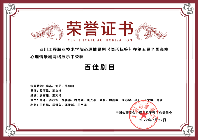 7月23日,第五届全国高校心理情景剧大赛决赛在山东济南落幕。由电气信息工程系辅导员李晶和学校学生处大学生心理教育中心刘艺、牛丽丽三位老师指导学生参演的作品《隐形翅膀》,通过大赛网络投票、专家评审,最终从来自全国200余所高校共计287个剧目中脱颖而出,荣获全国心理情景剧大赛“百佳剧目”奖项。
