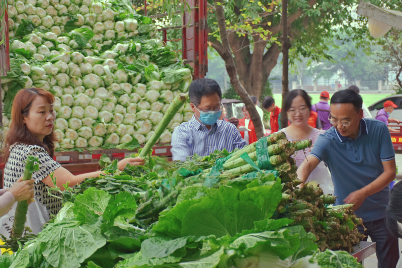 “助力乡村振兴 买颗高原蔬菜”“莴笋2.5元一斤!白菜1.5元一斤!”,在艾莱克公司图文预告宣传下,学校教职员工及家属们对前一天还长在海拔三千多米高原地里物美价廉的蔬菜颇为期待,纷纷前来购买。秋雨如丝情谊长,助力振兴干劲足,下午两点,一万六千多斤白菜、一万五千多斤莴笋全部完成卸货,并通过零售和食堂认购的方式一售而空。