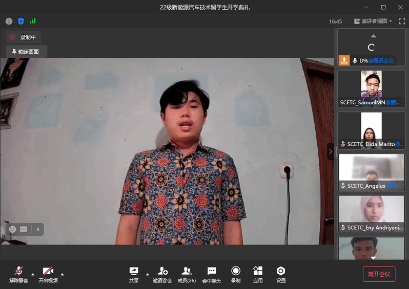 9月19日上午10:00,四川工程职业技术学院2022级新能源汽车专业来华留学生开学典礼举行。受疫情影响,本次开学典礼采取线上方式进行。学校副院长郭杰教授,印中商务理事会会长吴明理先生,印尼人力资源有限公司总经理韩许亚女士,交通工程系、外事办相关领导,留学生班班主任,任课教师代表,2022级新能源专业全体印度尼西亚留学生及家长共同参加了开学典礼。典礼由外事办公室副主任何冬梅主持。