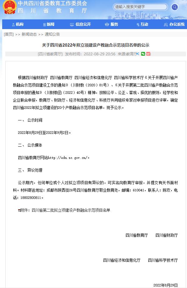 2022年8月29日,四川省财政厅 四川省教育厅 四川省经济和信息化厅 四川省科学技术厅对四川省2022年拟立项建设产教融合示范项目名单进行公示。学校与东方电气集团东方电机有限公司联合申报的四川省第二批产教融合示范项目——四川省清洁能源发电装备产学研协同创新平台入选公示名单。
