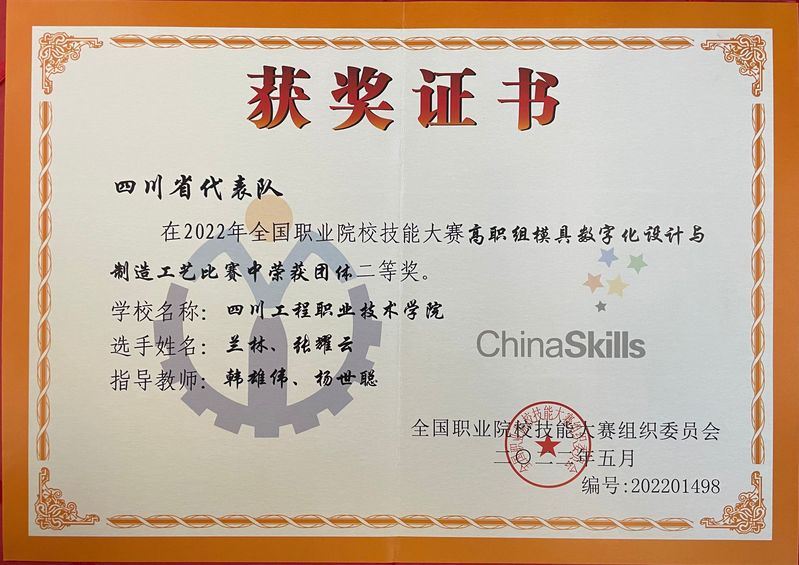8月6日至10日,2022年全国职业院校技能大赛(高职组)模具数字化设计与制造工艺赛项在山东省烟台市举行,本次赛项由山东省教育厅、烟台市人民政府承办,烟台职业学院联合山东辰榜数控装备有限公司等9家合作企业共同协办。来自全国各地的55支参赛队伍、230余名师生参赛。我校机电工程系2020级模具专业兰林、张耀云代表学校参赛,由韩雄伟教授、杨世聪老师负责指导。经过三天紧张激烈的角逐,我校代表队脱颖而出,最终荣获团体二等奖,这是四川省模具数字化设计与制造工艺赛项代表队取得的历史最好成绩。