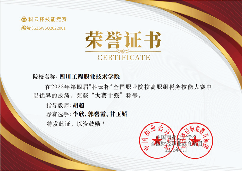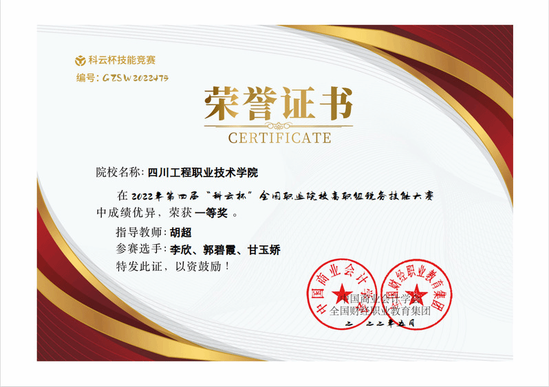 近日,2022年第四届“科云杯”全国职业院校高职组税务技能大赛圆满落下帷幕。由我校经济管理系会计学子李欣、郭碧霞、甘玉娇,张玉婷、冯丽、文玲茜组成的四川工程职业技术学院代表队,在全国300余所学校、591支参赛队伍参与、竞争激烈的大赛中,以昂扬的斗志一路披荆斩棘,勇创佳绩,包揽了“全国第一名”“大赛十强院校第一名”的殊荣。