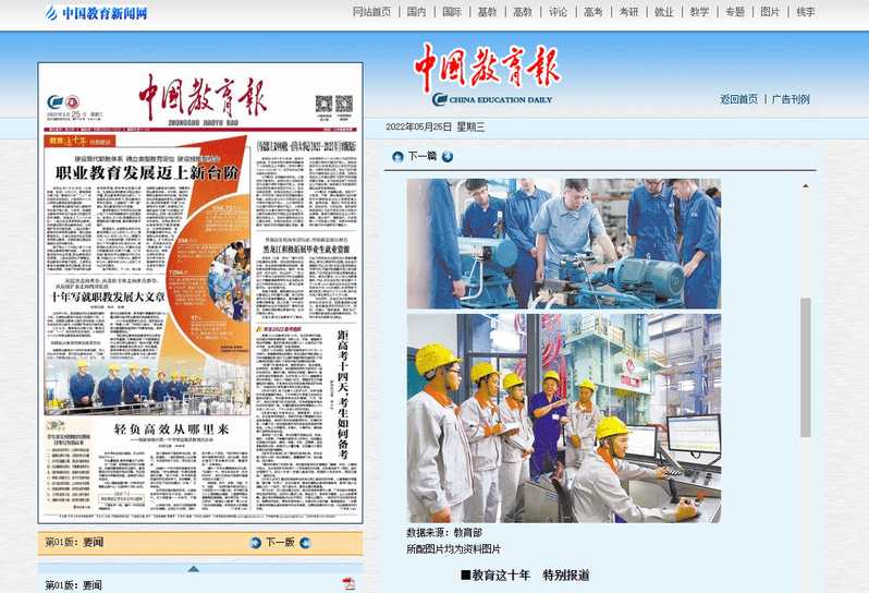 5月24日上午,教育部举办第三场“教育这十年”“1+1”系列发布采访活动,介绍党的十八大以来职业教育改革发展成就。《中国教育报》发表题为《建设现代职教体系 确立类型教育定位 建设技能型社会——职业教育发展迈上新台阶》特别报道,我校与二重联合培养八万吨大型模锻压机操作人才案例入选。(消息来源:http://paper.jyb.cn/zgjyb/html/2022-05/25/content_609917.htm?div=-1)