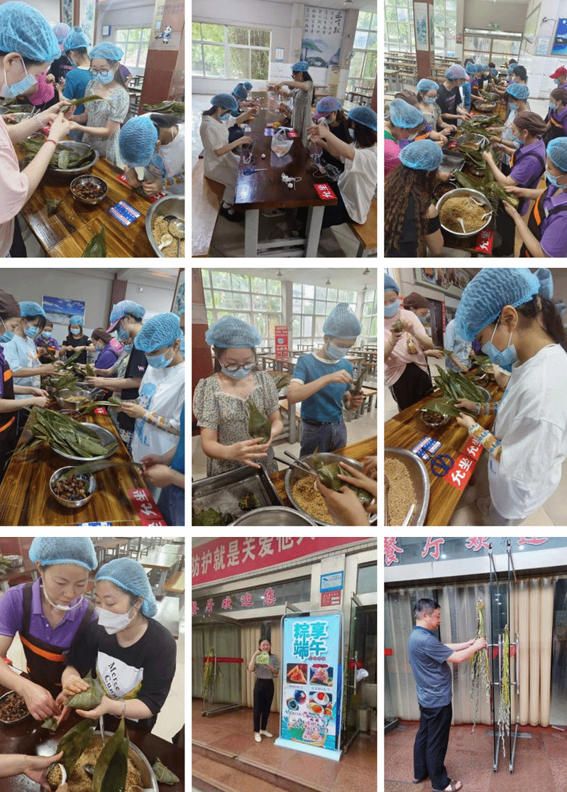 在竹苑餐厅大堂,食堂员工结合着六字口诀“折”“取”“放”“卷”“捏”“盖”,手把手地将包粽子诀窍传授给大家,伴随着学习的深入以及越来越娴熟的手法,同学们的战果也不断丰盛起来,“卤肉粽”“红豆粽”“红枣粽”“白味粽”……一个个枕头粽越堆越高,喜悦、兴奋、激动之情溢于言表。包完粽子后,大家把提前准备好的艾叶挂于食堂门前,品尝着自己的劳动成果。师生员工间谈笑风生,不时传来阵阵欢声笑语,在一片其乐融融的氛围中,“包粽小分队”度过了一个轻松、愉快的下午。