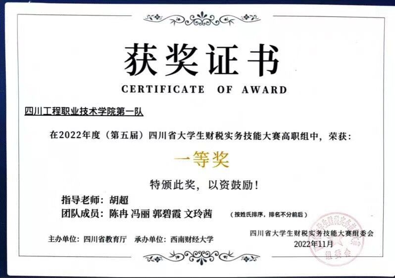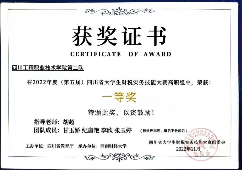 顽强拼搏获佳绩、奋勇争先展风采、以赛促优强素质。2022年10月23日,由我校经济管理系2020级会计专业甘玉娇、纪唐艳、李欣、张玉婷,和陈冉、冯丽、郭碧霞、文玲茜组成的两支参赛队伍,不畏强手、奋力超越,从51支参赛队伍中脱颖而出,以四川省第一名、第三名的骄人成绩勇夺四川省大学生财税实务技能大赛(高职组)两项一等奖。