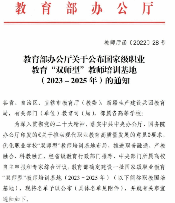 12月8日,教育部国家级职业教育“双师型”教师培训基地名单向社会公布,我校在众多申报院校中脱颖而出,成功入选。