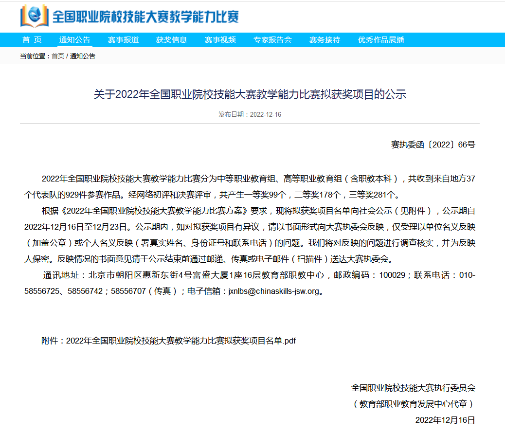 图1 2022年全国职业院校技能大赛教学能力比赛获奖项目公示