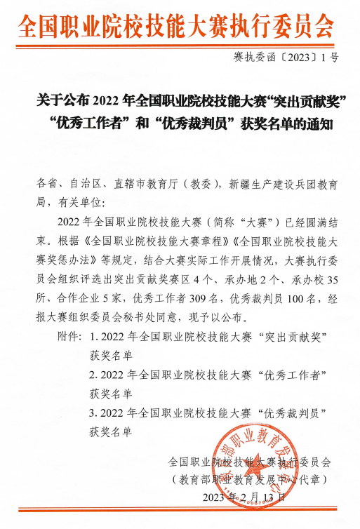 2023年2月13日,全国职业院校技能大赛执行委员会公布了2022年全国职业院校技能大赛“突出贡献奖”“优秀工作者”和“优秀裁判员”获奖名单,我校作为承办校荣膺2022年全国职业院校技能大赛“突出贡献奖”。同时,我校机电系主任冯锦春获评“优秀工作者”,本赛项的专家组组长张飞霞、监督仲裁员卢晓慧获评“优秀工作者”,裁判员杨建西获评“优秀裁判员”。