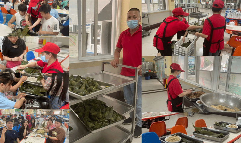松苑食堂为大家准备了丰富的食材,并且邀请五位食堂员工担当师傅,负责现场技术指导。当准备工作完成后,五位师傅开始采用传统技法包粽子,包得又小又俏,有放豆沙的,有加卤肉的,还有原味的,放在餐盘上整齐可爱。