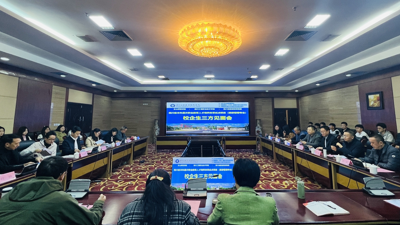 根据《四川省教育厅关于开展2022年本科层次职业教育人才培养改革试点工作的通知》要求,四川工程职业技术学院与乐山师范学院、四川省旅游投资集团有限责任公司联合开展了本科层次职业教育人才培养改革试点项目(旅游管理专业)。2022年9月,46名职业教育本科学生到四川工程职业技术学院报到并进行学习。为了解学生学习情况、提高人才培养质量,2023年3月22日下午,我校与乐山师范学院、四川省旅游投资集团“四川省本科层次职业教育人才培养改革试点项目”校企生三方见面会在图书馆108会议室顺利举行。两校领导、集团代表以及2022级旅游管理专业本科班全体学生参与了此次会议。