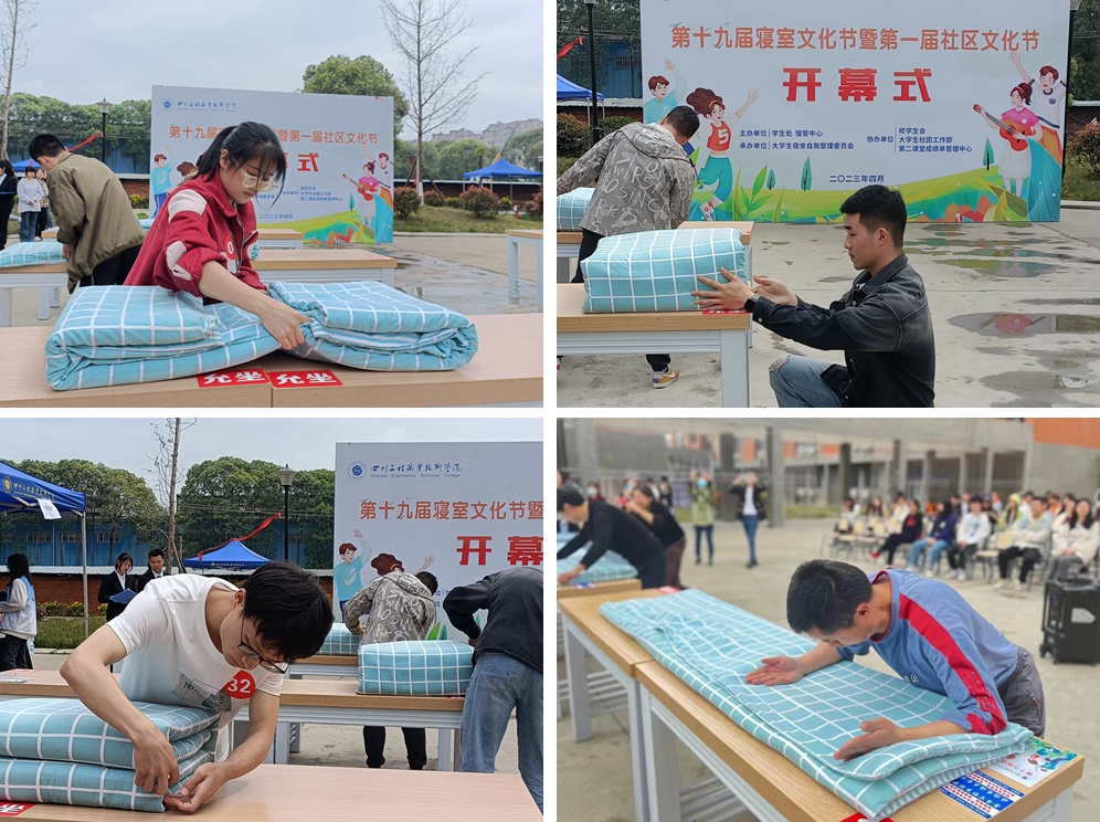 学生服务党总支书记廖秀勇宣布活动开幕,随后举行了叠军被比赛和趣味游园活动。宿管中心老师、宿管阿姨和各宿舍推荐的参赛学生同台竞技,参赛选手争分夺秒,使出浑身解数,捏线、折角,激烈的比赛赢得了同学们的阵阵掌声,一个个整齐的“豆腐块”丈量的是规则尺度、严谨作风,体现的是细致入微、身体力行。据悉,本次社区文化节还将开展摄影比赛、文化滋养活动、创意集市、微课堂等系列活动。