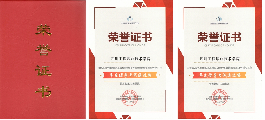 2023年4月28日,我校建筑工程系收到了由廊坊市中科建筑产业化创新研究中心(国家职业教育培训评价组织)颁发的1+X装配式建筑构件制作与安装职业等级证书、1+X建筑信息模型(BIM)职业等级证书试点工作“年度优秀考试通过奖”荣誉证书。