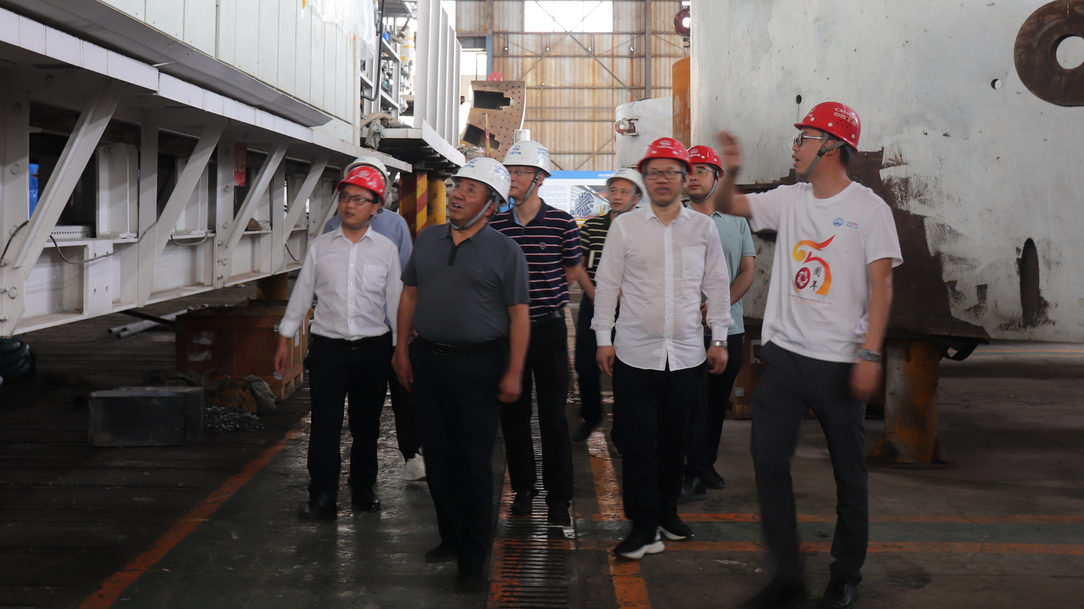 李登万书记一行参观了盾构机总装、盾构机刀盘维修、盾构机刀具维修等作业车间,与正在作业的我校2020级盾构维修现场工程师—中铁工服班同学瞿宗磊进行了亲切交流,并鼓励同学踏踏实实干,为我国盾构事业贡献力量。