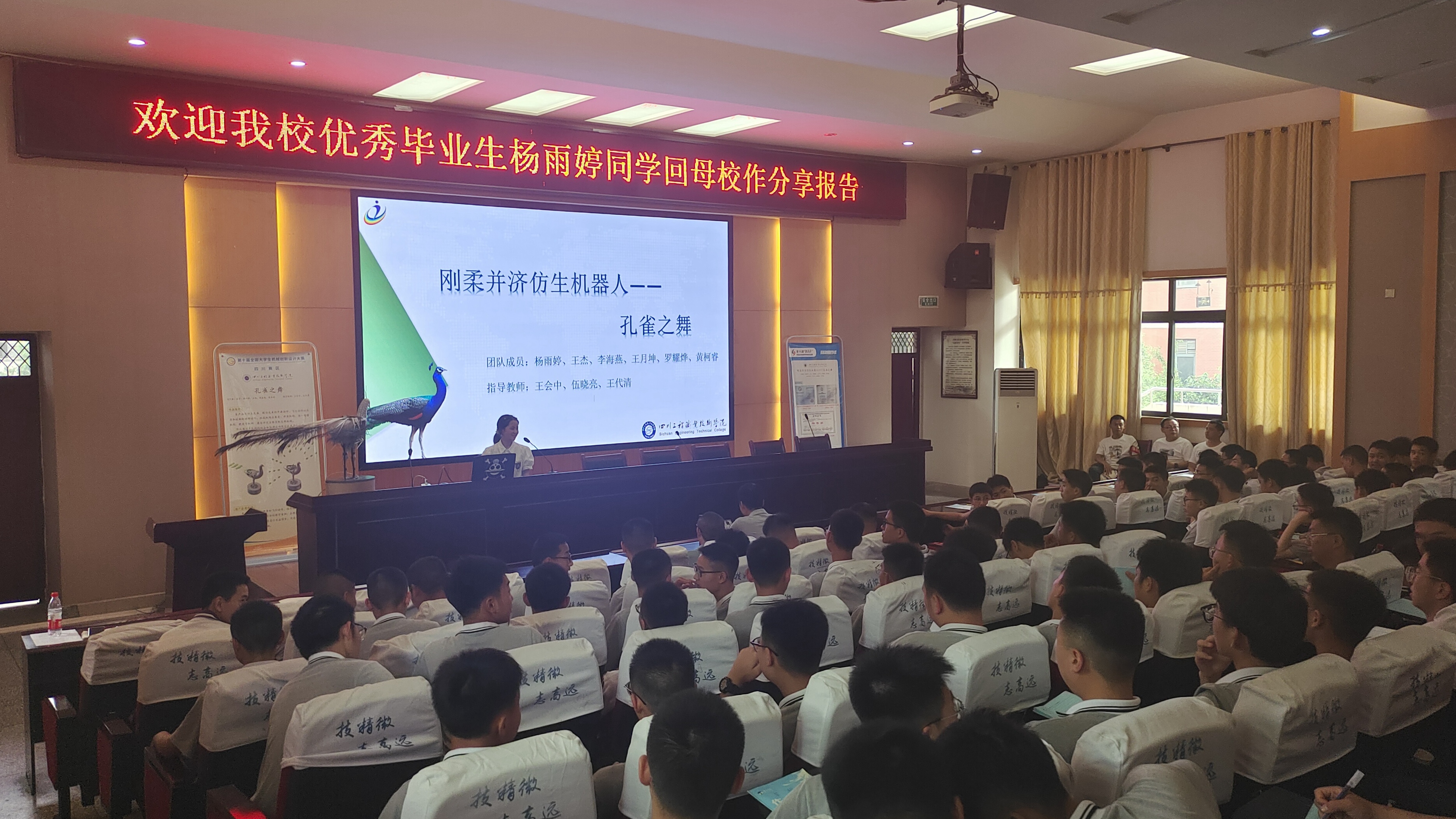 5月31日,我校机电工程系优秀学生杨雨婷同学回高中母校邛崃市职业教育中心作分享报告。杨雨婷同学分享了她在大学里的成长经历,以及带领团队在2023年第十七届“挑战杯”省赛中以“孔雀之舞”作品勇夺特等奖并晋级国赛的心得体会。