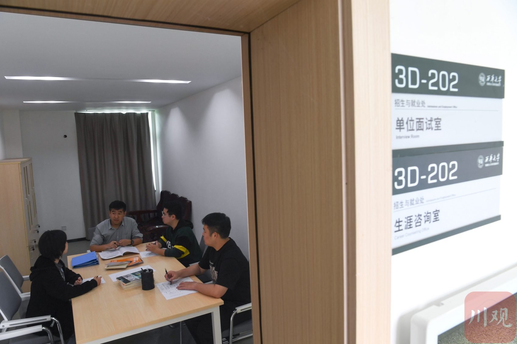 5月11日,西华大学招生与就业处生涯咨询室内,就业处老师崔青青(左二)为学生们提供就业指导。肖雨杨/摄