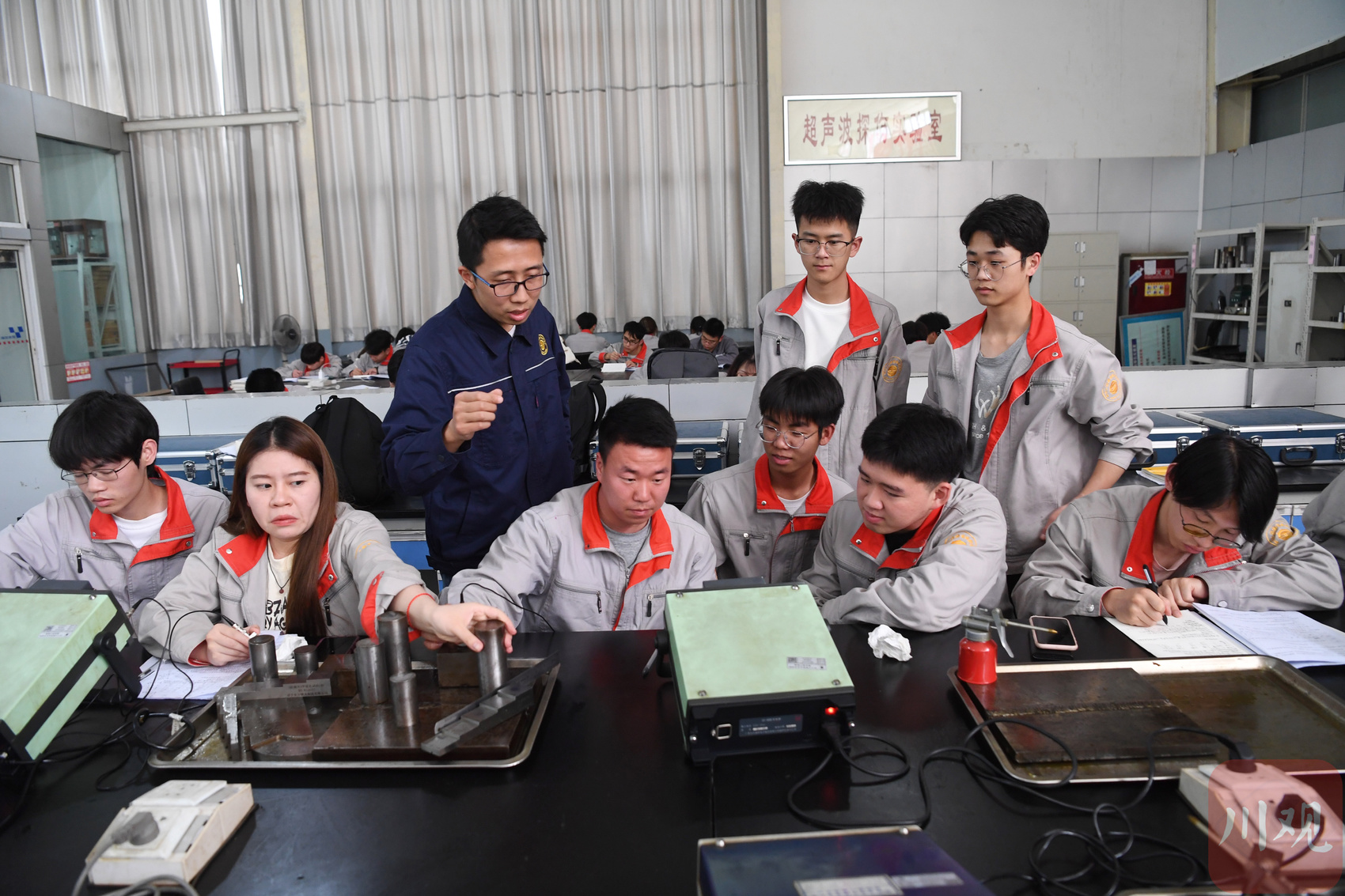 5月10日,四川工程职业技术学院航空材料检测中心内,2021级理化测试与质检技术专业学生在进行超声波检测实训。肖雨杨/摄