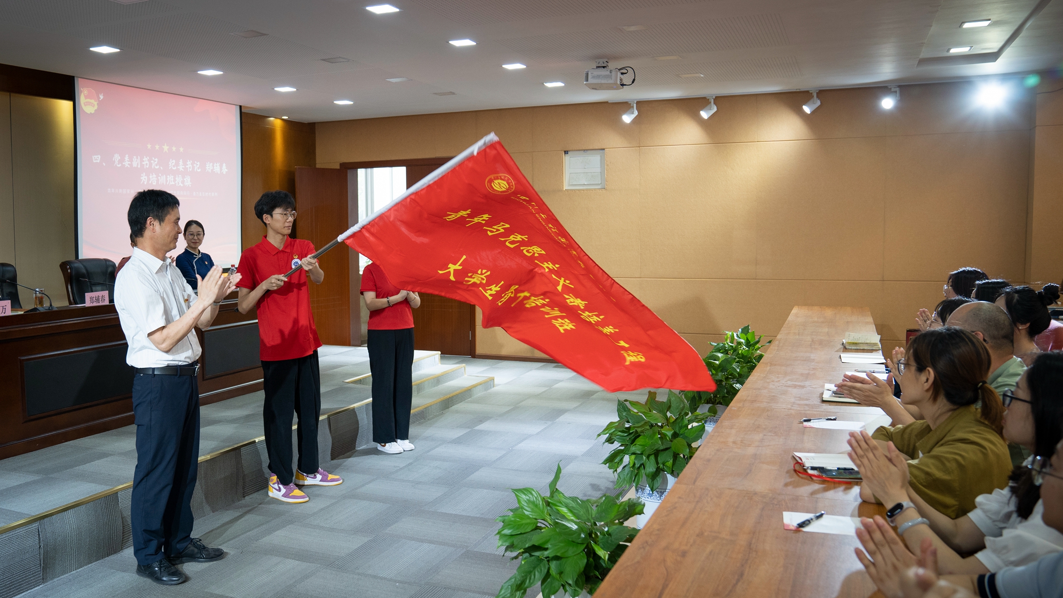 郑辅春副书记为第三期“青年马克思主义者培养工程”大学生骨干培训班授班旗,希望所有学员在班旗的指引下,努力学习、积极实践,全面提升自身综合素质,用自己的行动为班旗增光添彩。