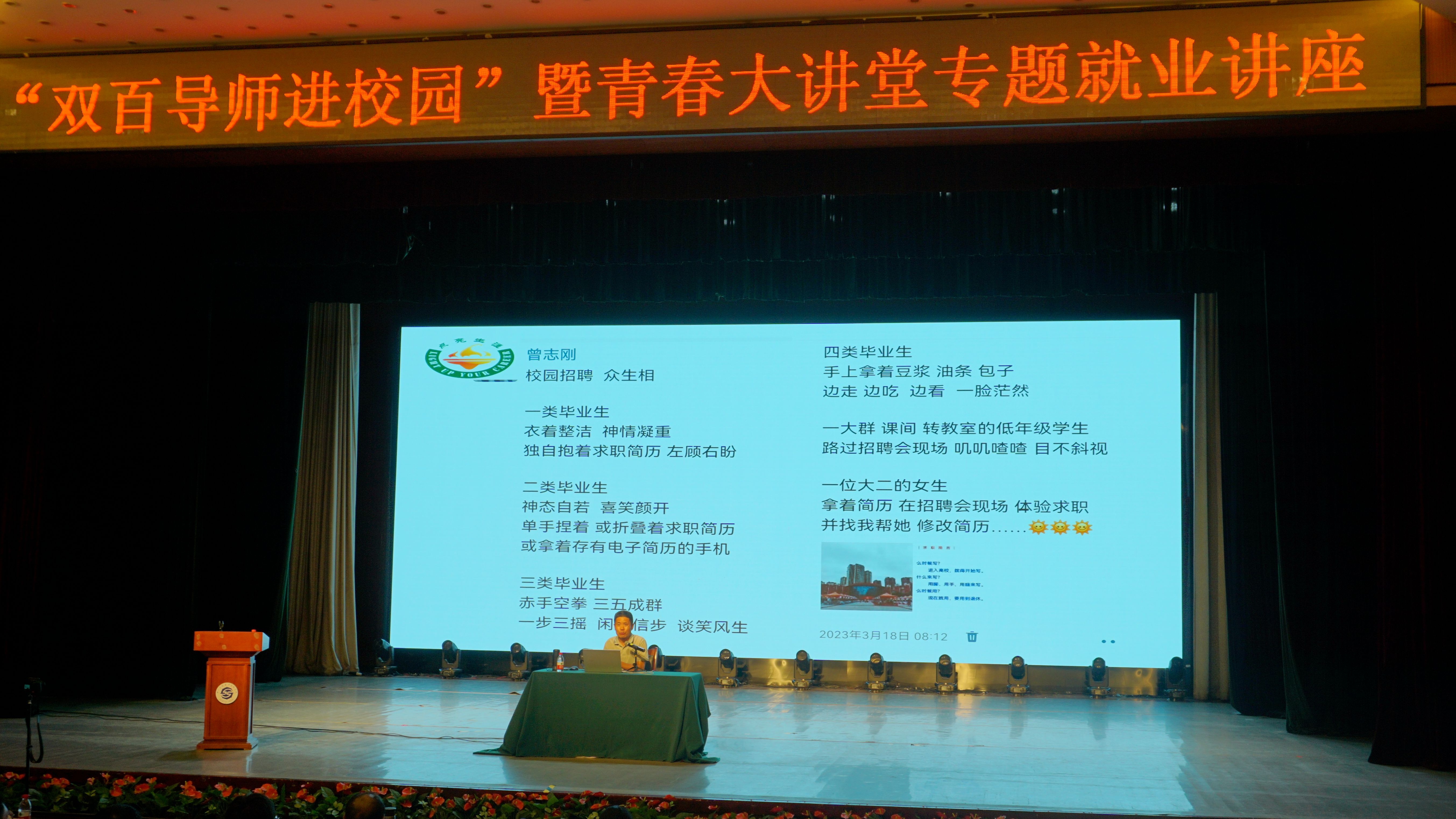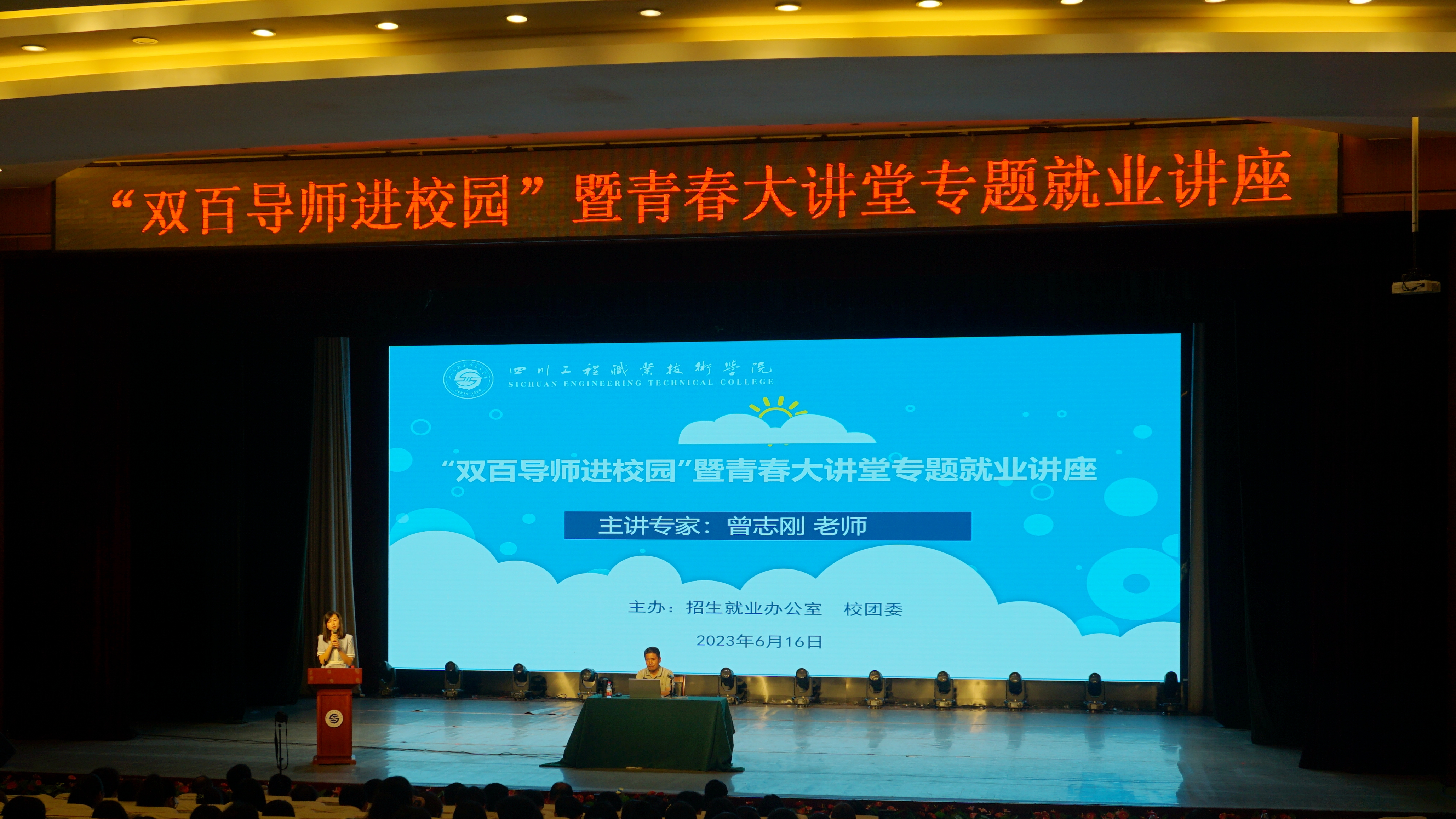 2023年6月16日下午,由学校招生就业办和校团委联合主办的“双百导师进校园”暨青春大讲堂专题就业讲座在二教演讲厅顺利开展。讲座旨在深入学习贯彻党的二十大精神,落实党中央、国务院关于高校毕业生就业工作决策部署,根据《四川省教育厅关于举办四川省2023届高校毕业生就业促进周暨开展“百日冲刺”系列活动的通知》和《共青团四川省委 四川省教育厅 四川省人力资源和社会保障厅关于在四川省各高校开展“青春就业大讲堂”的通知》文件精神要求,抢抓就业工作关键期,充分做好学生就业指导服务工作,全力以赴促进学校毕业生高质量充分就业。