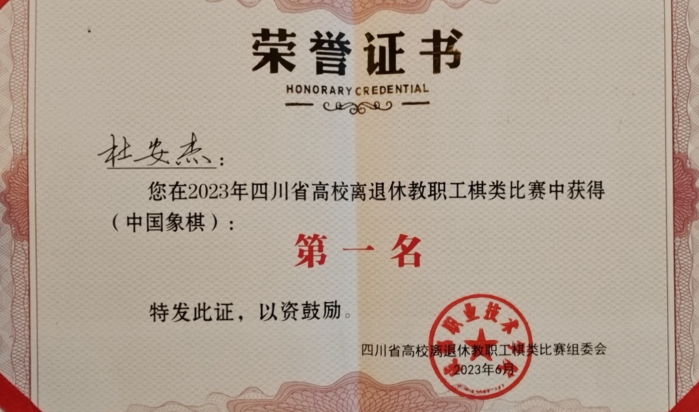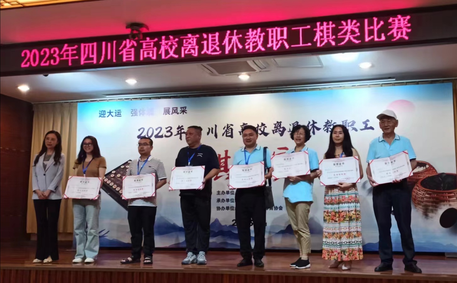 本次棋类比赛设中国象棋、围棋2个项目,共有来自四川大学、电子科技大学、西南民族大学等30所高校和教育厅直属代表队的68名退休职工参加了比赛。我校由杜安杰、李以渝2位退休教师组成的代表队分别参加了中国象棋和围棋比赛,经过五轮紧张激烈的角逐,杜安杰老师以全胜的战绩勇夺中国象棋个人赛第一名,我校荣获本次大赛优秀组织奖。
