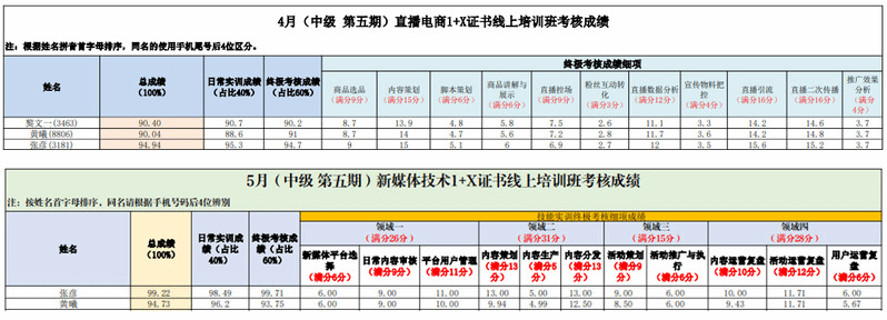 1+X直播电商证书(中级)线上培训时间为4月19日—4月21日,考核时间为4月27日。1+X新媒体技术证书(中级)线上培训时间为5月10日—5月12日,考核时间为5月19日。培训教师除按照课表在线上观看理论和技能实训视频外,还需完成每个领域的技能实训日常训练,并参加技能实训全国统考。最终培训考核总成绩=技能实训日常考核成绩*40%+技能实训终极考核成绩*60%。