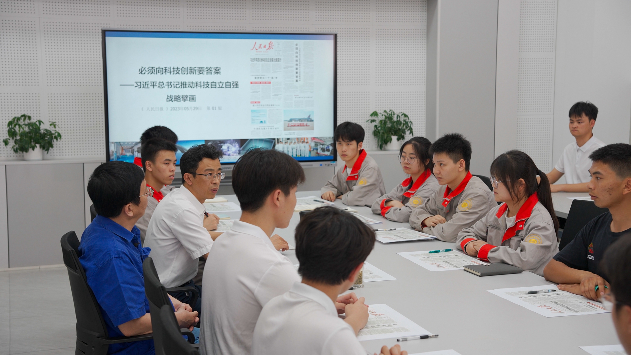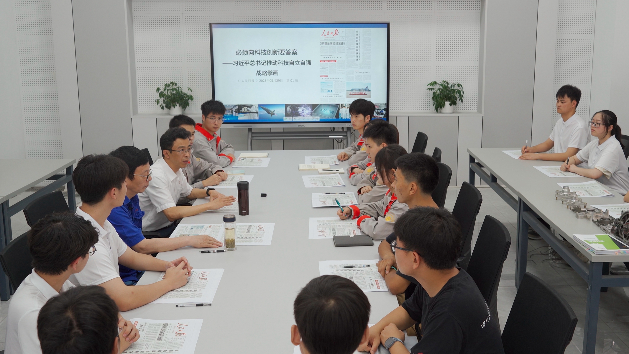 为推动新时代党的创新理论入脑入心,做好学习贯彻习近平新时代中国特色社会主义思想主题教育,持续引导学生读党报党刊、学原文原著,推进“大思政课”建设,6月20日下午,校党委副书记、院长肖峰教授与“能工巧匠”培养计划训练班的学生代表,共同参加“师生共读党报”主题学习会。肖峰院长首先带领同学们走进四川省冲压发动机先进制造技术工程实验室,工程实验室首席专家、教授级高级工程师陈晓慈向大家介绍了学校围绕航天装备制造产业,聚焦冲压发动机构件的结构优化、特殊合金增材制造及其热处理工艺等共性技术研究和产品试制方面的成果。随后,大家一同走进会议室,学习阅读了《人民日报》 2023年5月29日头版文章:《必须向科技创新要答案——习近平总书记推动科技自立自强战略擘画》。肖峰院长整段领读了文章,并围绕新时代十年伟大成就和学校育人实际对原文进行生动地领学。学习会气氛既认真严肃又轻松和谐,参会的师生代表围绕科技强国、科技报国展开了热烈讨论。四川工程巴哈车队的学生代表,还就“巴哈赛车上有哪些零部件可以替换成增材制造的零部件”等问题,与肖峰院长、陈晓慈教授展开了探讨。最后,肖峰院长对在座同学提出希望:职业教育与国运兴衰紧密相连,为全面建设社会主义现代化国家提供着坚强有力的人才保障和技能支撑。伟大事业始于梦想,基于创新,成于实干。希望同学们要牢记习近平总书记殷殷嘱托,努力成长为高素质技术人才、能工巧匠、大国工匠,在时代的浪潮中谱写技能报国新篇章。(文/图 马克思主义学院、党委宣传部)