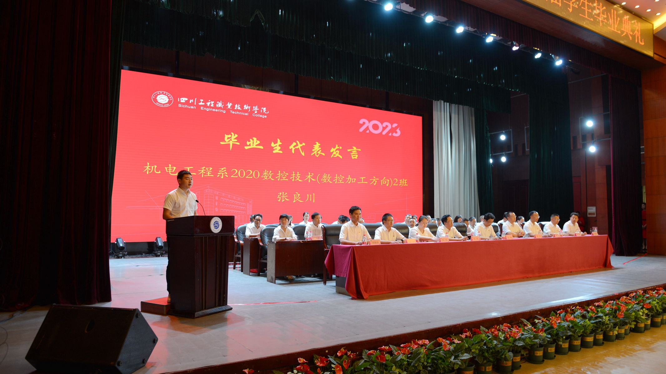 2022年全国职业院校技能大赛高职组“工业设计技术”赛项一等奖获得者、2022年“四川省大学生年度人物提名”奖获得者,机电工程系2020数控技术(数控加工方向)2班张良川同学作为毕业生代表发言。张良川分享了三年间在能工巧匠班的成长经历,表达了对母校培养的感激之情。