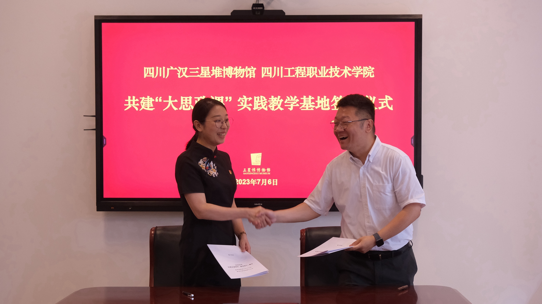 2023年7月6日上午,在广汉三星堆景区管委会,四川工程职业技术学院与三星堆博物馆共建“大思政课”实践教学基地合作协议的签约仪式举行。广汉市委副书记、三星堆博物馆景区管委会主任王居中,三星堆博物馆景区管委会副主任魏清,三星堆博物馆景区管委会办公室主任陈昌彬,我校党委常委、党委宣传部部长、政策法规处处长王静,马克思主义学院主持工作副院长杨雅涵等出席签约仪式。