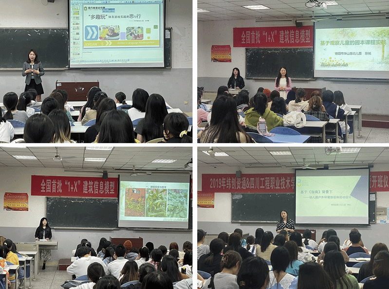 德阳市旌阳区三幼副园长蒋虹,以“基于《指南》背景下幼儿园户外环境创设与活动设计”为题,从幼儿园面临的实际问题“新园区该如何创设适宜环境”出发,向学生介绍了“什么是幼儿园环境”“幼儿园环境的实际意义”“怎样创设科学合理的幼儿园环境”“怎样以实际环境进行户外活动设计”几个方面的内容。
