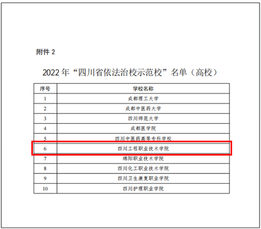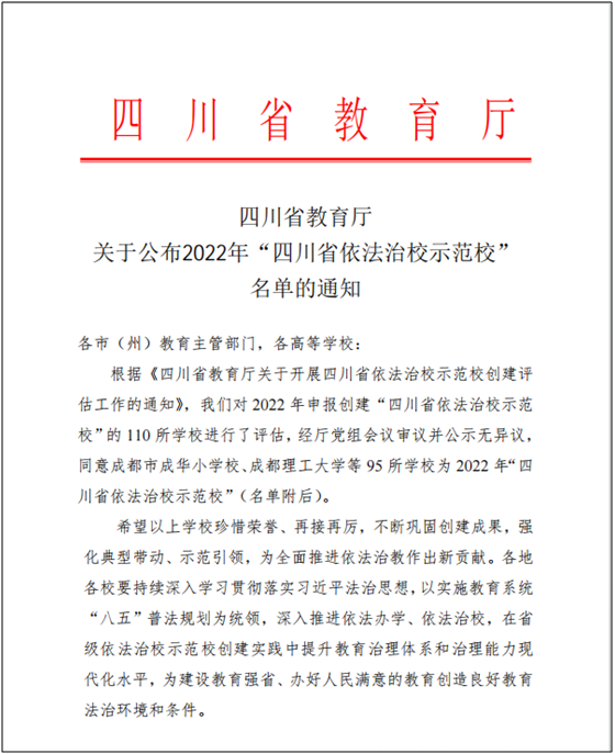 近日,四川省教育厅公布《2022年“四川省依法治校示范校”名单》,我校获评2022年“四川省依法治校示范校”。