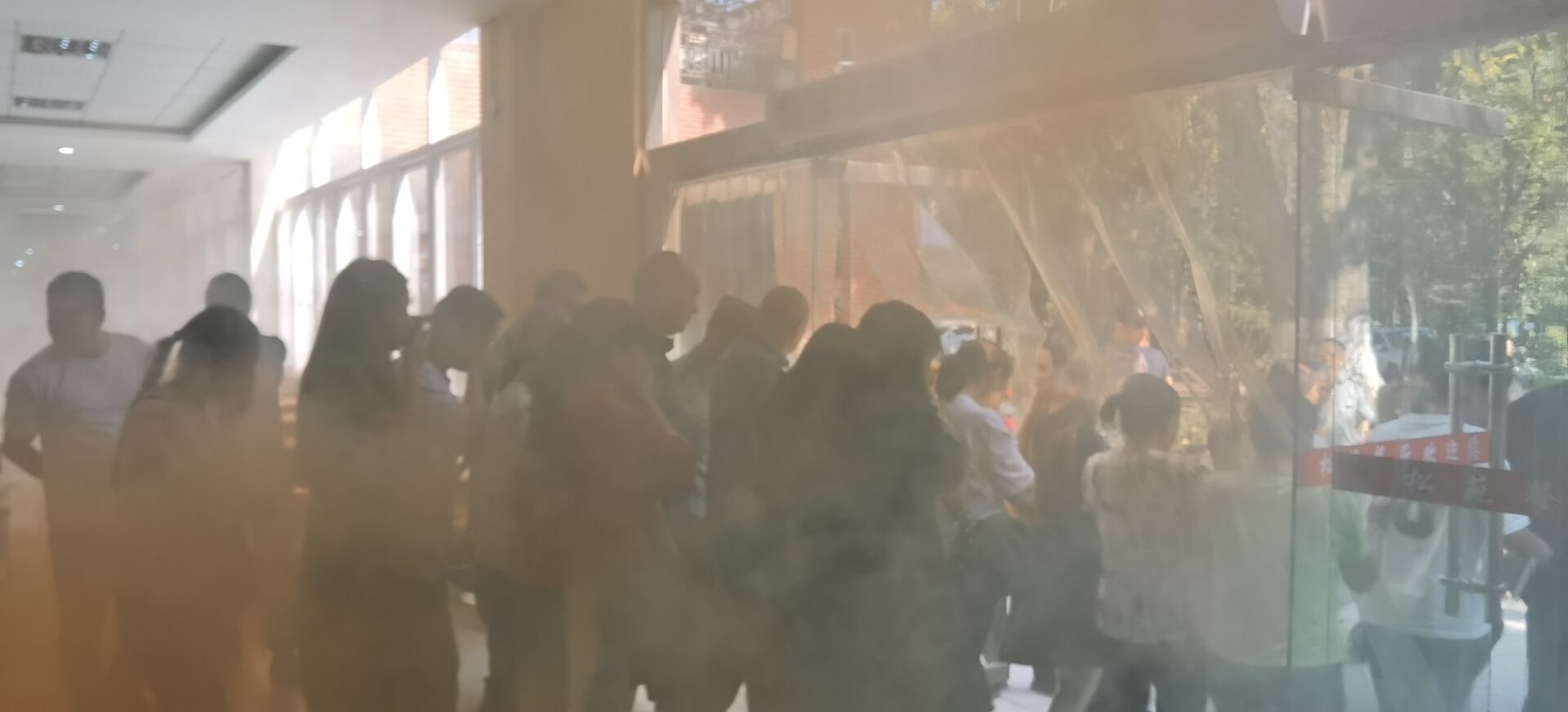 参训教职工在学校二食堂集中开展疏散应急演练,在释放烟雾弹后,随着一声哨响,300余名教职工从疏散通道撤离,整个疏散过程紧张有序,参训教职工全部安全、迅速地到达指定地点。