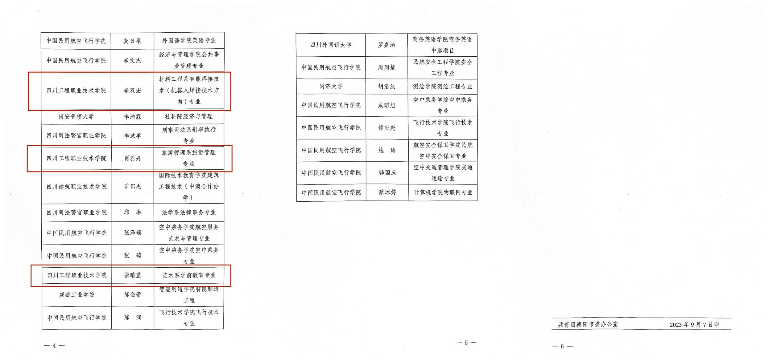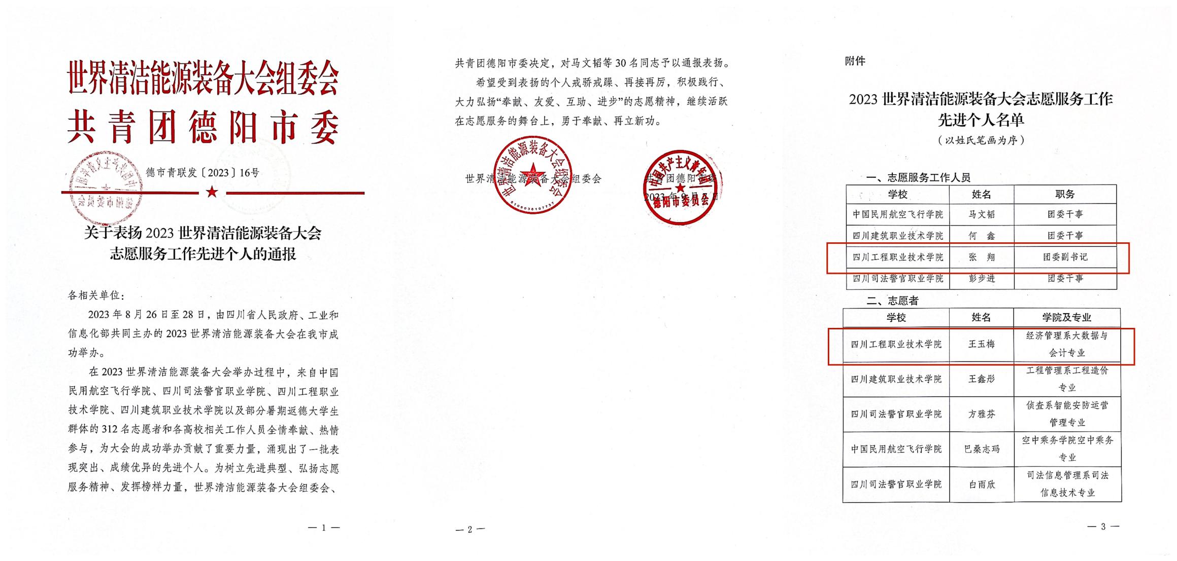 2023年8月26日至28日,由四川省人民政府、工业和信息化部共同主办的2023世界清洁能源装备大会在我市成功举办。我校52名学生志愿者参与了大会志愿服务工作,以优质高效的服务水平得到了市委、市政府和大会组委会充分肯定。我校1名教师、4名学生荣获“2023世界清洁能源装备大会志愿服务工作先进个人”荣誉称号。