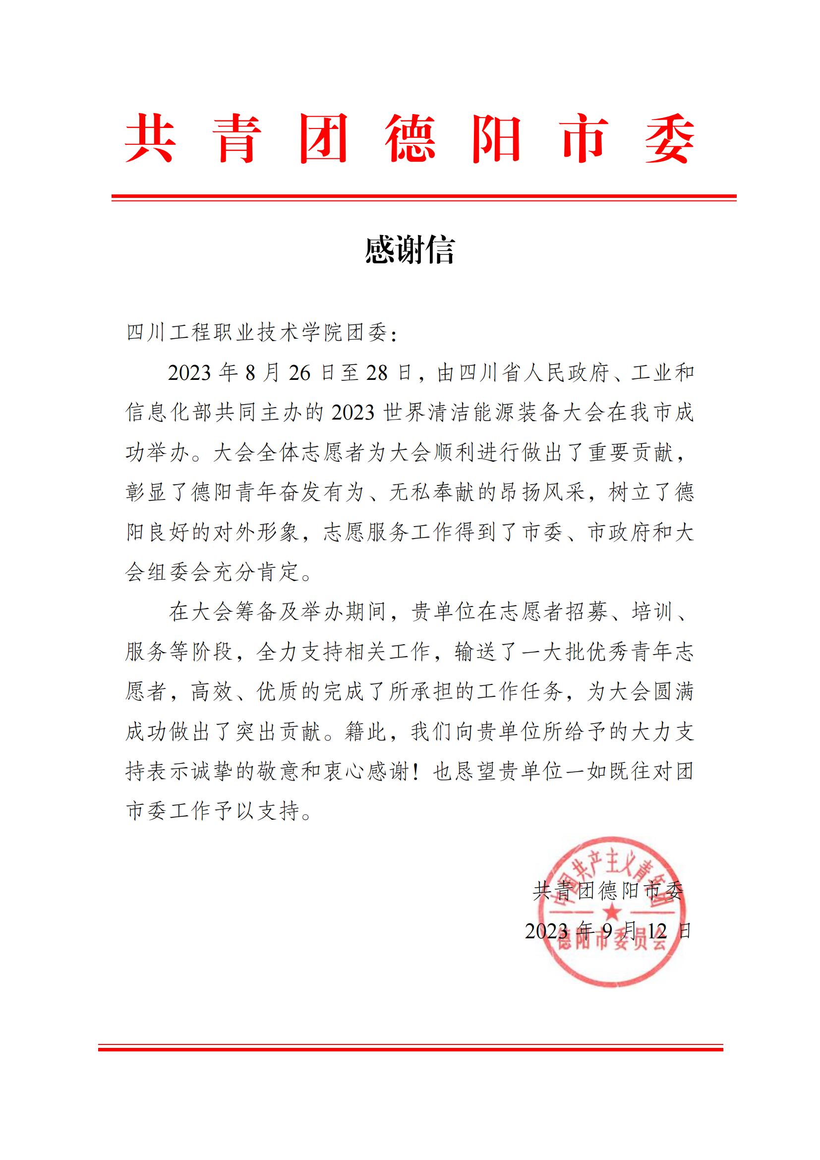 近日,共青团德阳市委发来感谢信,感谢学校在2023世界清洁能源装备大会志愿者招募、培训、服务等阶段提供的巨大支持,充分肯定了我校志愿者的服务意识,展示了新时代中国青年的昂扬风貌。