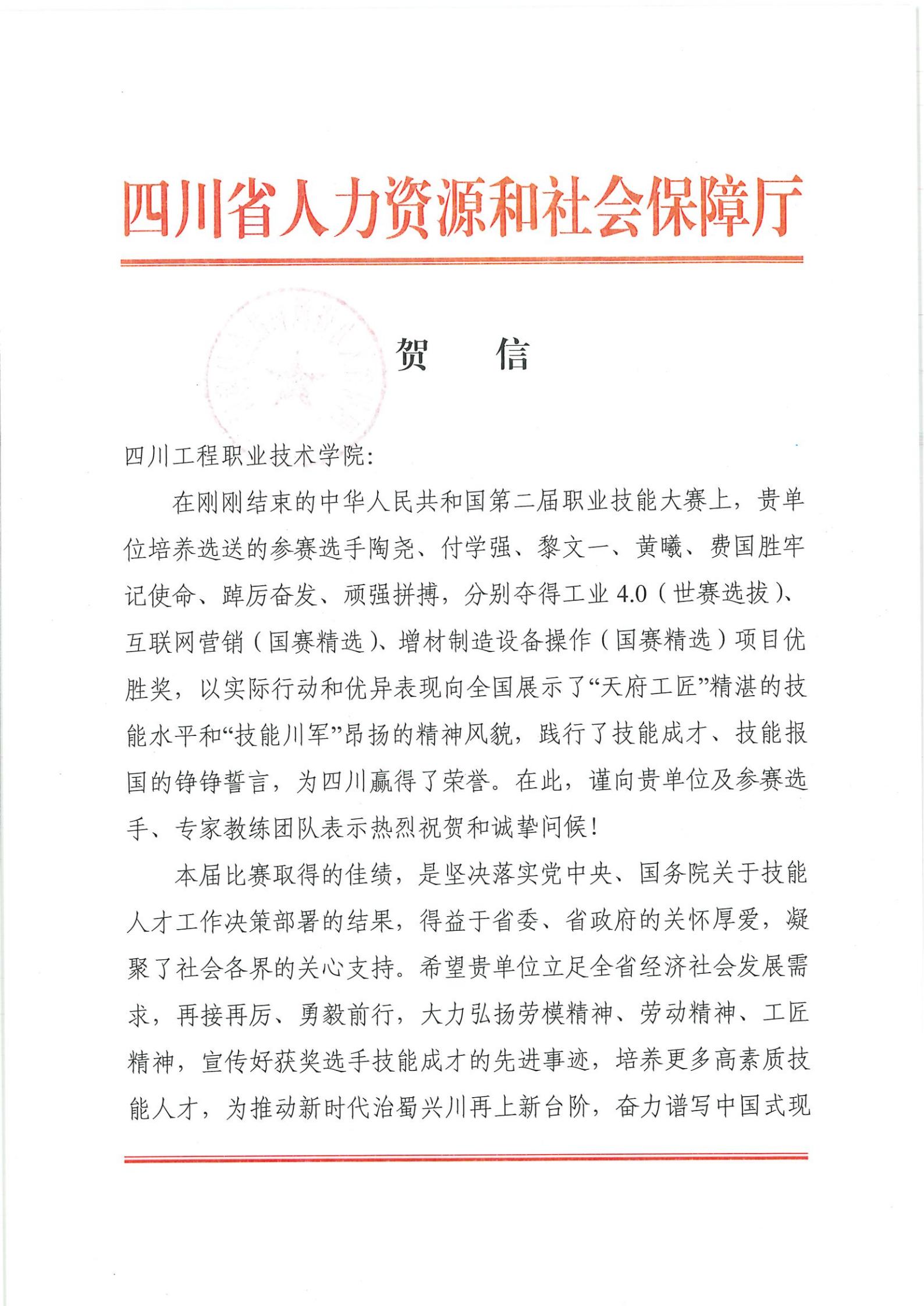 9月27日,四川省人力资源和社会保障厅发来贺信,祝贺我校在中华人民共和国第二届职业技能大赛中取得佳绩,向我校及参赛选手、专家教练团队表示热烈祝贺和诚挚问候! 中华人民共和国第二届职业技能大赛是人力资源社会保障部主办的综合性国家职业技能赛事,于2023年9月16日至19日在天津举办。我校4个项目获得国赛资格,其中陶尧、付学强、黎文一、黄曦、费国胜5名选手将获得优胜奖,既赛出了风采,也诠释了拼搏精神和工匠精神。(文/图 教务处、创新创业教育指导中心)