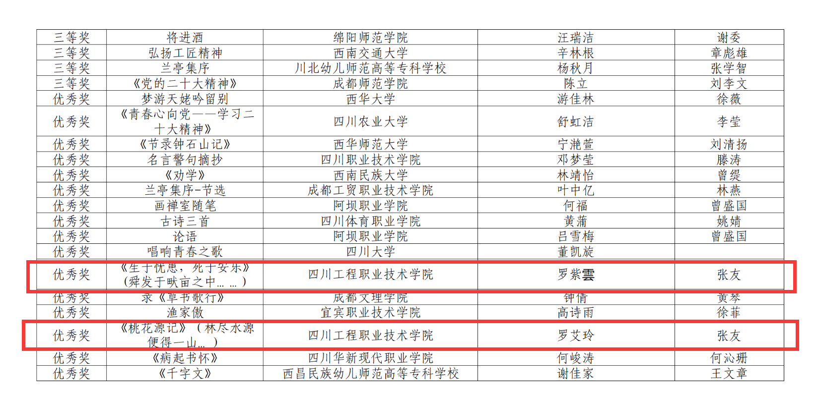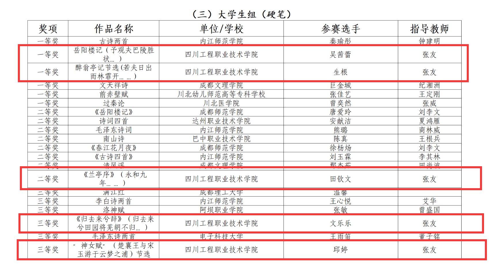 电气工程系张友书记指导学生吴茜蕾参赛的作品《岳阳楼记》、生根参赛的作品《醉翁亭记节选》获“笔墨中国”汉字书写大赛四川赛区大学生组(硬笔)一等奖,指导学生田钦文参赛的作品《兰亭序》,获“笔墨中国”汉字书写大赛四川赛区大学生组(硬笔)二等奖,指导学生于文文参赛的作品《归去来兮辞》、邱婷参赛的作品《“神女赋”》节选,获“笔墨中国”汉字书写大赛四川赛区大学生组(硬笔)三等奖,指导学生罗紫雲参赛的作品《生于忧患,死于安乐》、罗艾玲参赛的作品《桃花源记》,获“笔墨中国”汉字书写大赛四川赛区大学生组(硬笔)优秀奖。